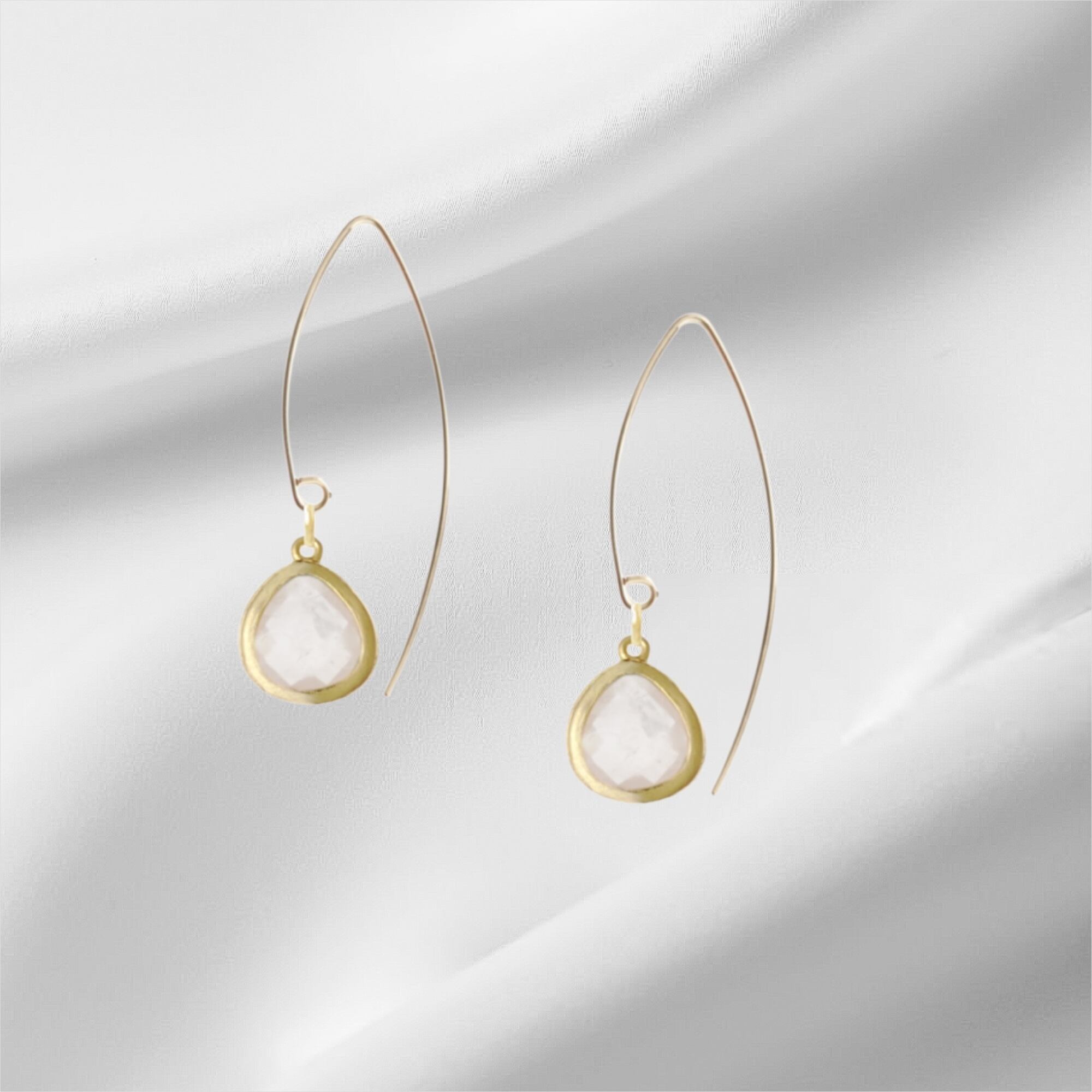 耳元で揺れるローズクオーツは、シンプルながらも存在感があり、華やかです。